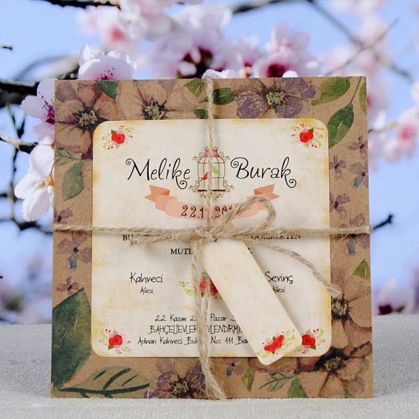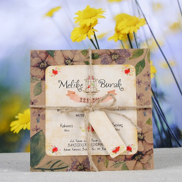 Retro Davetiye 327 online sipariş ve yetkili satış merkezi. Retro Davetiye 327 eskitme kraft kağıttan yapılmış olup çiçek desenleri ile süslenmiştir.
