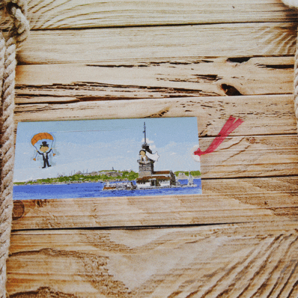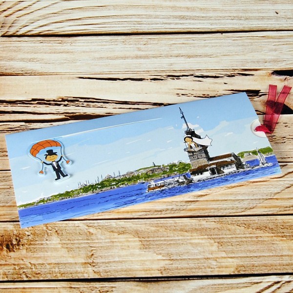Retro Davetiye 333 online sipariş ve yetkili satış merkezi. Retro Davetiye 333 modelinde bilgilerin yer aldığı kağıt sağdan çekildiğinde balonla uçan damat kız kulesindeki geline doğru gitmektedir.