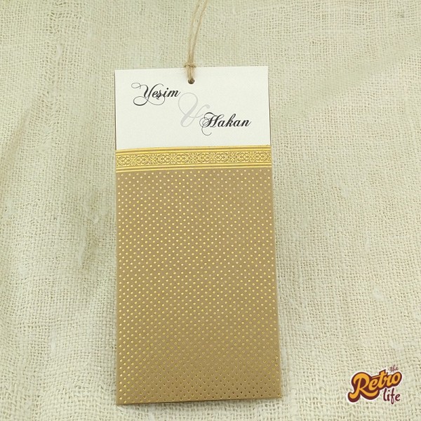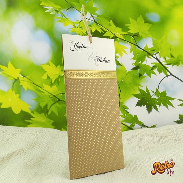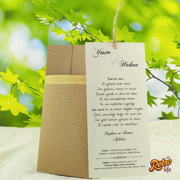 Retro Davetiye 340 online sipariş ve yetkili satış merkezi. Retro Davetiye 340 eskitme kraft kağıttan yapılmış olup desenler altın yaldız baskıdır. Bilgilerin yer aldığı kağıt krem rengindedir.
