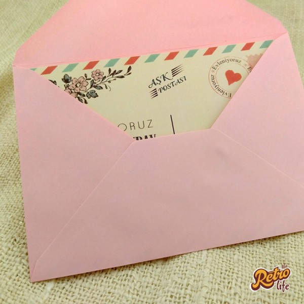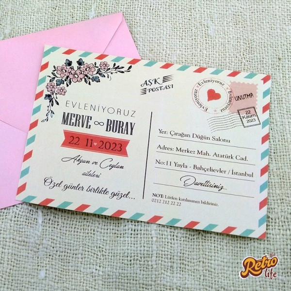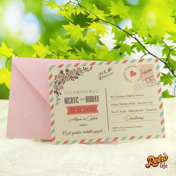 Retro Davetiye 341 online sipariş ve yetkili satış merkezi. Retro Davetiye 341 kartpostal şeklindeki davetiye pembe zarf ile gönderilmektedir.