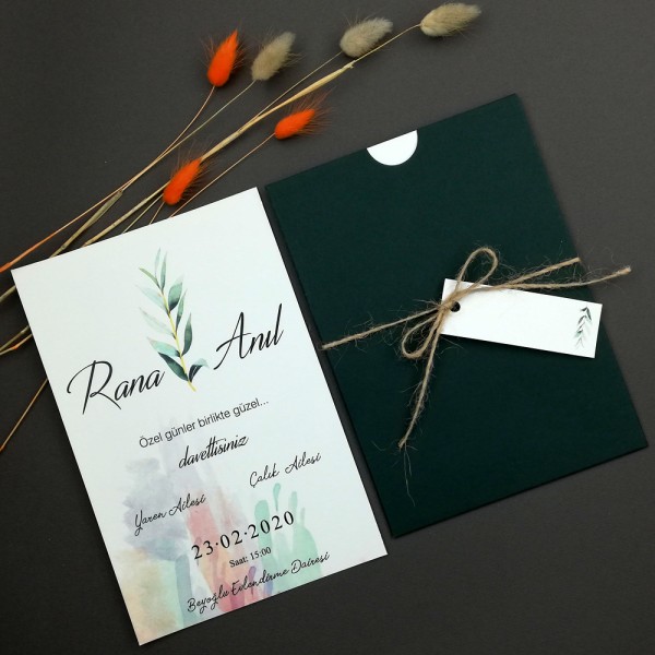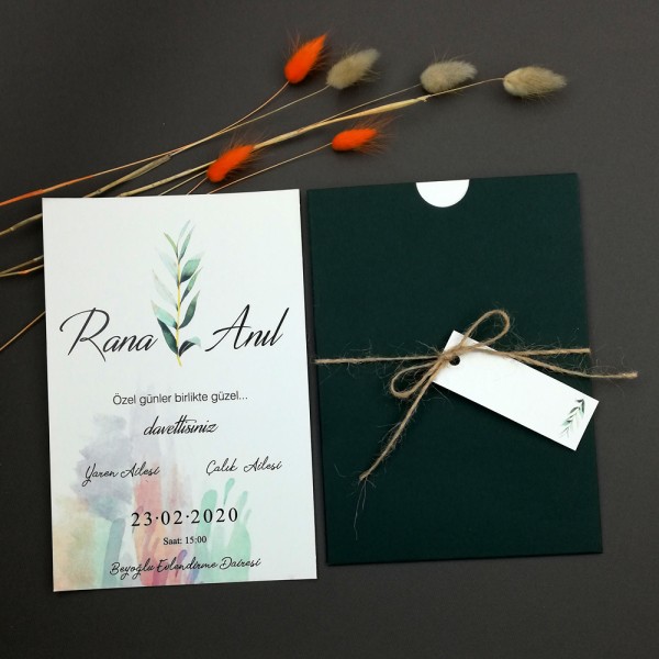 Retro Davetiye 423 online sipariş ve yetkili satış merkezi. Retro Davetiye 423 koyu yeşil zarf, hasır ip ve isim etiketi ile birlikte gönderilmektedir.