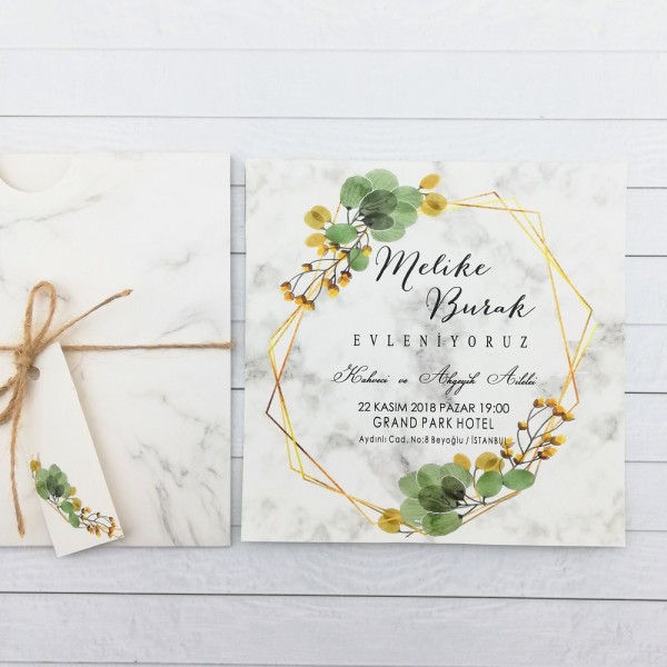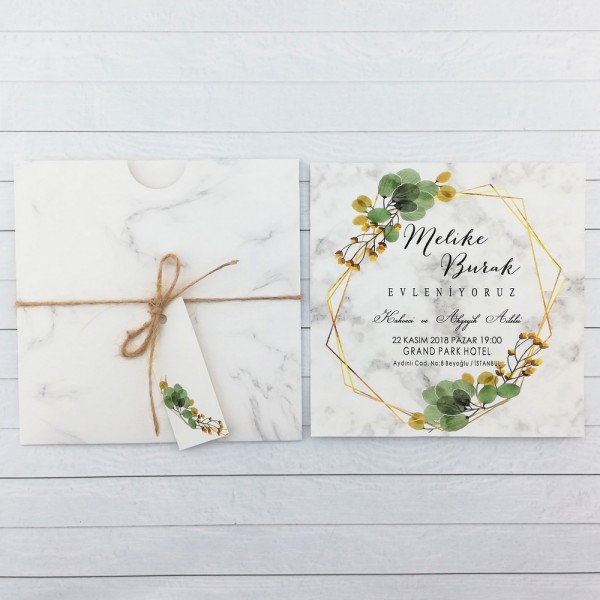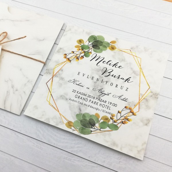 Retro Davetiye 431 online sipariş ve yetkili satış merkezi. Retro Davetiye 431'in zarfı ve bilgilerin basıldığı kağıt mermer deseni basılmış kağıttır. Zarfı kalın gramaj kağıttan yapılmıştır. İp ve isim etiketi ile birlikte gönderilmektedir.