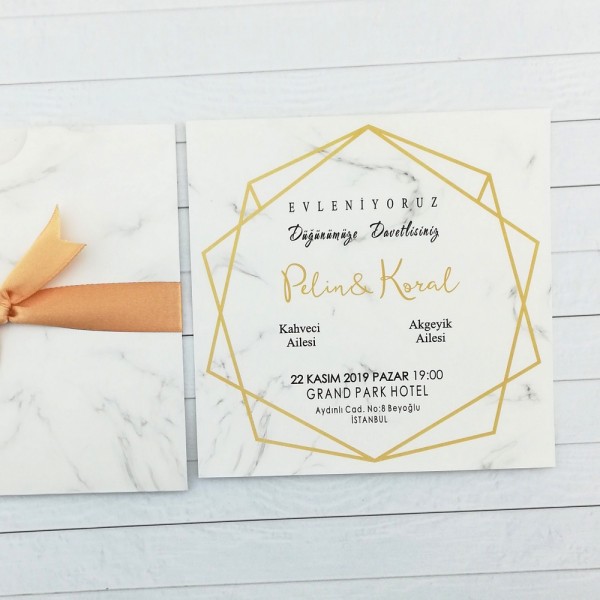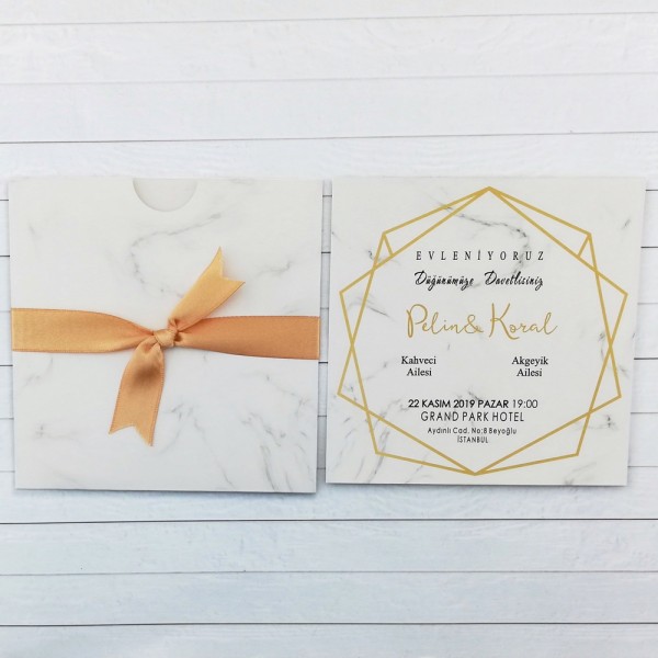 Retro Davetiye 439 online sipariş ve yetkili satış merkezi. Retro Davetiye 439'un zarfı ve bilgilerin basıldığı kağıt mermer deseni basılmış kağıttır. Zarfı kalın kağıttan yapılmıştır.